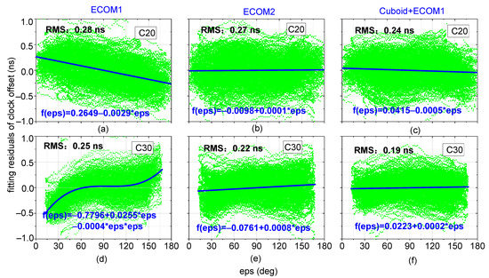 Comparing Figure 7 and Figure 8, it can be seen that the clock residuals were consistent with those of the satellite orbit and also had a systematic variation with respect to the angle. The ECOM2 and Cuboid + ECOM1 model can reduce the systematic variation of the residuals of C20 and C30. For C20, the fitting curve of the ECOM2 had a smaller intercept and slope than Cuboid + ECOM1. However, the fitting RMS of Cuboid + ECOM1 was slightly smaller than that of ECOM2. For C30, the fitting curve of the Cuboid + ECOM1 had a smaller intercept, slope, and RMS than ECOM2. For the Cuboid + ECOM1 model, the improvements of RMS were about 0.06 (24%) and 0.04 ns (14%) for C30 and C20, respectively. In general, the average RMS of ECOM2 was larger than that of the Cuboid + ECOM1 model. The main reason was that the greater number of parameters of ECOM2 reduces their observability and result in less stable results than those of the ECOM1 model, especially for the small observations of the BeiDou-3 satellites.