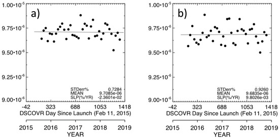 MODIS is a scanning radiometer that has a scan-angle dependent calibration. In C6.1 L1B product, the MODIS sensor’s response versus scan-angle (RVS) is operationally characterized using onboard calibrator measurements supplemented with the long-term instrument response derived at different scan angles over multiple pseudo-invariant calibration sites [27]. A recent study performed by Bhatt et al. [28] reported residual RVS dependencies in MODIS C6.1 calibration. The Aqua-MODIS band 1 showed a temporal positive trend of ~1.5% in its left-side scans Earth-view measurements during 2015–2018. The EPIC sensor views the Earth under backscatter conditions, and the corresponding matches from Aqua-MODIS and VIIRS are only obtained from the left side of the scan. The Aqua-MODIS trend for left-side scan positions was determined for most channels to be 0.3%/year (see MODIS RVS in Table 3). Similarly, the VIIRS-relative backscatter trend was computed for the same scan positions and was found to be insignificant, except for the two shortest wavelength bands.