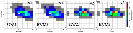 The E7/A1 and E7/M5 (0.65 µm) V01 (v1) and V02 (v2) navigation correction shift position 0.25° latitude (y-offset) by 0.25° longitude (x-offset) frequency plots. The center white or black box represents no spatial shift or perfect navigation.