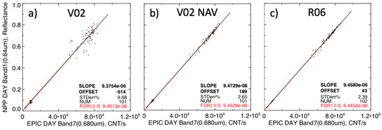 The (a) EPIC E7 V02, (b) V02 with navigation correction (V02-NAV), and (c) R06 radiance and NPP-VIIRS I1 (0.65 µm) ATO-RM reflectance pairs for 19 September 2016. The SLOPE (black line), OFFSET, and STDerr% are the slope (1/cnt s−1), offset (cnt s−1), and standard error in (%) of the linear regression. NUM refers to the number of EPIC and VIIRS ray-matched pairs. FOR[0.0] (red line) is the linear regression forced through the origin (1/cnt s−1).