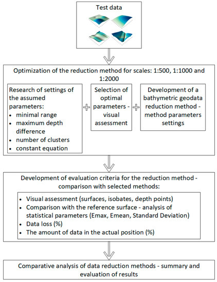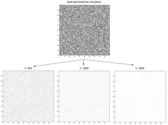 Then, after rejecting the wrong results, the optimal parameter settings were selected, and the reduction method was developed in detail, which will apply to the bathymetric geodata. This enabled us to determine the optimal settings of our built-in reduction method following the detailed analysis of selected parameters including the simultaneous visualization of reduced geodata on bathymetric reporting site plans at different scales. The steps included in our reduction method with determined parameters are summarized in Figure 5.
