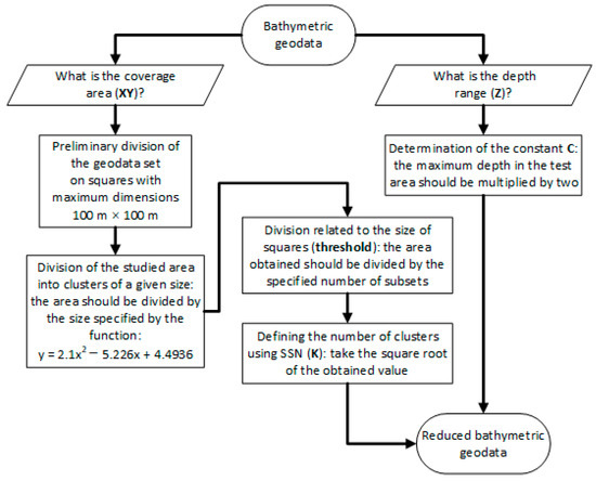 We designated a geodata border domain such that the range depended on the coordinates of the input area. In this approach, one of the following three conditions must be met: there is only one survey point within a given domain or there are none at all; the size of the side of a divided area must be smaller than the threshold value assumed by the operator; and the actual depth difference within a tested area must be smaller than that indicated by the operator. A domain will, therefore, either not be divided into smaller areas, or it will be cut into four equal squares. This process was then repeated until the assumptions discussed above were met; sets of data comprised the outputs from these iterations, their number varied depending on the characteristics of input area, and minimum and maximum values of location and depth range were associated with bottom shape. It has to be noted that the first stage of the proposed reduction method is intended for the initial division of bathymetric data and it prepares data for clustering; it is the pre-processing of big data. Big data problems were also taken from References [31,32,33,34].