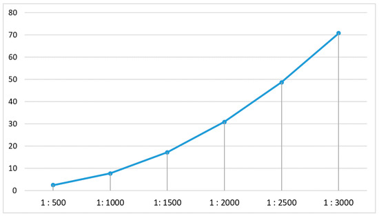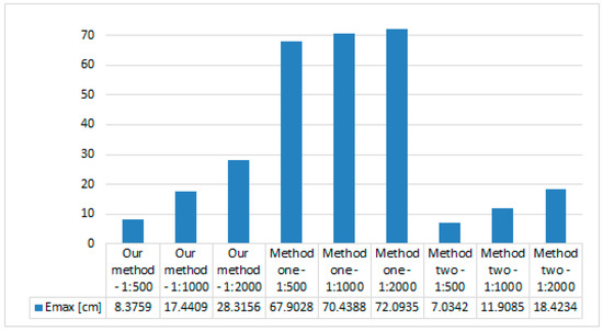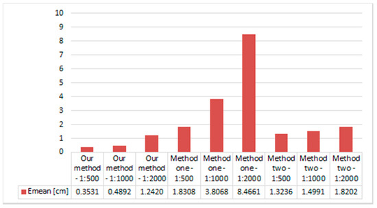 Indeed, the largest mean error at the level of 8.47 cm was obtained for points reduced using method one at a 1:2000 scale, while similar mean errors ranging between 1.32 cm and 1.82 cm were also generated using method number two. Smallest error values were obtained using our novel method; however, for 1:500 and 1:1000 scales, these errors were less than 0.50 cm and were just 1.24 cm at a 1:2000 scale (Figure 11).