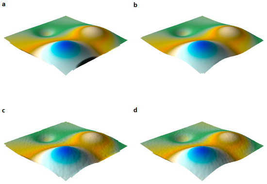 Surfaces obtained at a 1:500 scale using test surface No. 1. (a) Reference; (b) our method; (c) method number one; (d) method number two.