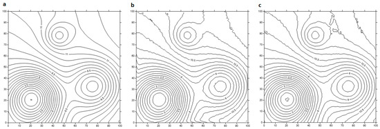 We evaluated each of our test datasets, but due to the large amount of data, we present only a description of test surface No. 1 for the purposes of this paper. The surface from which data were generated in this case comprises an irregular shape containing shallow and deep areas (test surface No. 1 in Figure 1). Initial bathymetric plans of seawater at selected scales showing depth points were developed on the basis of each received set; our visual assessment of depth points in each case was focused primarily on their spatial distribution such that they were ideally regularly distributed and their descriptions did not overlap. Subsequent to analysis of all visualizations for the test surface No. 1, it was clear that the points obtained by our reduction did meet the visual assessment criteria as they only overlapped in a few places. Therefore, we concluded that in this case, a hydrographer’s interference cannot be avoided during data development using our new approach. It was also the case that points remained clearly visible when method number one was applied, as these were interpolated values that had a regular distribution. The last case we examined also met our visual assessment criteria, although there was a tendency for values to cluster on isolines. One representative example of the results obtained at a scale of 1:1000 is presented in Figure 7.
