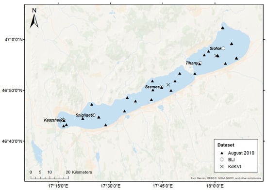 Map of Lake Balaton, indicating the routine monitoring stations (Balaton Limnological Institute, BLI; Central Transdanubian (Regional) Inspectorate for Environmental Protection, KdKVI), and the 35 stations from the August 2010 field campaign (August 2010).
