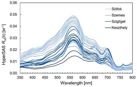 Mean in situ HyperSAS Rrs(λ) spectra measured in August 2010 in Lake Balaton (n = 30), showing the variability by basin from west (Keszthely) to east (Siófok).