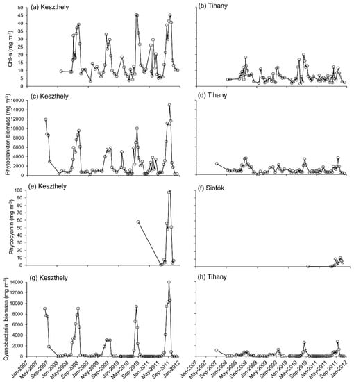 Inter-annual variations in (a,b) Chl-a, (c,d) phytoplankton biomass, (e,f) PC and (g,h) cyanobacteria biomass at Keszthely (westernmost basin) and Tihany or Siofók (easternmost basin; data from BLI routine monitoring).