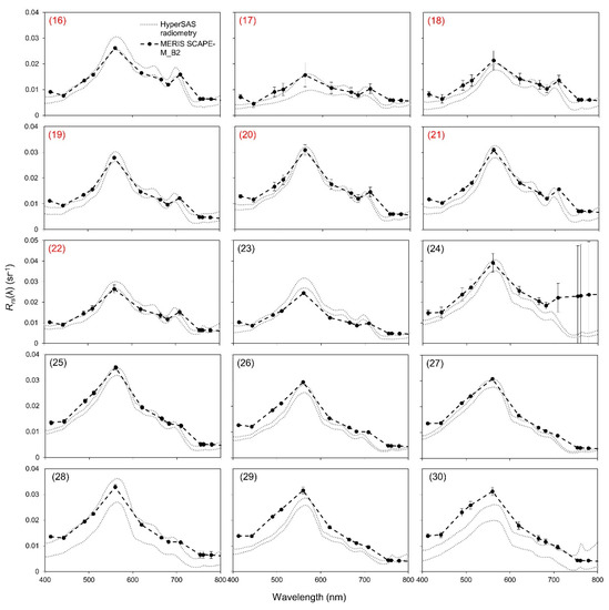 MERIS Rrs(λ) spectra atmospherically corrected with SCAPE-M_B2 and in situ HyperSAS radiometry Rrs(λ) data for stations 16–30. MERIS Rrs(λ) are the mean of a 3×3 pixel window with error bars indicating standard deviation. HyperSAS Rrs(λ) are shown as a range, with lines indicating the minimum to maximum Rrs(λ) recorded at each station. Same-day matchups include stations 16–22 only, shown in red (n = 7). Note the different ranges for y-axis values.