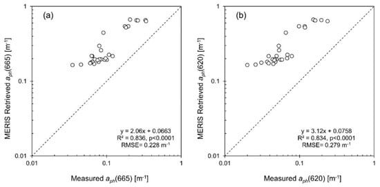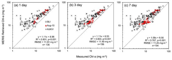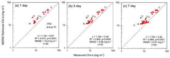Chl-a was retrieved from MERIS after estimating the absorption coefficient of phytoplankton at 665 nm. At ±1, 3- and 7-day matchup intervals, the Gons05 algorithm retrieved Chl-a with good performance using all datasets for validation, however MERIS-retrieved values typically overestimated measured values (RMSElog = 0.369–0.394, Biaslog = 0.296–0.329, MAPE = 132–151%, MdAPE = 74.2–86.4%, SMAPE = 63.0–68.5%; Figure 8; Table A3). There was also increased scatter in the relationship between retrieved and measured values at Chl-a concentrations <10 mg m−3 (±7 days: RMSElog = 0.476, MAPE = 208%) compared to higher Chl-a concentrations, >10 mg m−3 (±7 days: RMSElog = 0.384, MAPE = 142%). Furthermore, retrieved Chl-a values validated with surface samples from August 2010 only had higher R2 values (R2 = 0.906–0.943, p < 0.0001) and better agreement (RMSElog = 0.185–0.203, Biaslog = 0.167–0.199, MAPE = 50.0–58.9%, MdAPE = 50.6–52.7%, SMAPE = 38.1–45.0%; Table A4) than those validated with integrated samples routinely taken by BLI (R2 = 0.723–0.810, p < 0.0001, RMSElog = 0.331–0.337, Biaslog = 0.249–0.271, MAPE = 107–112%, MdAPE = 61.5–76.5%, SMAPE = 55.7–59.9%; Table A5) or surface samples from the KdKVI dataset (R2 = 0.784–0.786, p < 0.0001, RMSElog = 0.416–0.421, Biaslog = 0.352–0.355, MAPE = 165–169%, MdAPE = 101%, SMAPE = 72.7–73.3%; Table A6). When retrieved Chl-a values were restricted to those stations also used for PC validation, there was better agreement between MERIS-retrieved and in situ Chl-a concentrations (RMSElog = 0.211–0.241, Biaslog = 0.174–0.216, MAPE = 55.9–70.0%, MdAPE = 50.1–51.9%, SMAPE = 39.2–48.0%; Figure 9 and Table A7).