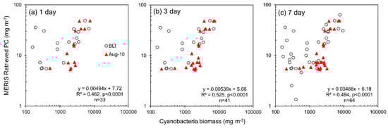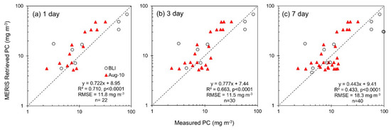 Phycocyanin concentrations were retrieved from MERIS data after estimation of aph(620), and were validated with measured concentrations from the August 2010 campaign and BLI routine monitoring data. The PC concentrations retrieved using Simis05 showed good agreement with the in situ data for matchups within 1, 3 or 7 days of the overpass (RMSElog = 0.261–0.273, Biaslog = 0.0218–0.147, MAPE = 63.0–77.0%, MdAPE = 49.5–50.8%, SMAPE = 48.2–49.8%; Figure 11 and Table A3). At all three time windows, retrieved PC values were a better fit with August 2010 surface samples for matchups ±7 days (R2 = 0.718, p < 0.0001; Table A4) than those validated with integrated samples routinely taken by BLI (R2 = 0.580, p < 0.01; Table A5). Determination coefficients were high for matchups with BLI data at ±1 and 3 days (R2 = 0.910, p < 0.001), however this is likely driven by the small sample size at these windows (n = 8). Overall, PC retrieved at all three time windows showed better agreement with the August 2010 surface samples (RMSElog = 0.246–0.254, Biaslog = 0.042–0.189, MAPE = 59.3–71.6%, MdAPE = 52–61.2%, SMAPE = 49.4–49.9%) than the BLI-integrated samples (RMSElog = 0.301–0.324, Biaslog = −0.026–0.100, MAPE = 71.7–86.4%, MdAPE = 33.1%, SMAPE = 45.4–50.7%). As with Gons05, the Simis05 algorithm did not accurately retrieve PC values below approximately 5 mg m−3, and this was most noticeable with the greatest matchup window of ±7 days (PC < 5 mg m−3: RMSElog = 0.366, Biaslog = 0.284, MAPE = 126%, MdAPE = 69.7%, SMAPE = 58.7%; PC > 5 mg m−3: RMSElog = 0.253, Biaslog = −0.0244, MAPE = 51.9%, MdAPE = 45.6%, SMAPE = 48.2%).