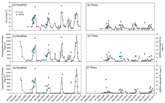 Inter-annual variations in cell counts are shown from 2007 to 2011 for total phytoplankton and cyanobacteria biomass, alongside Chl-a and PC pigment data (Figure 3). Lake Balaton generally has a spring (January–March) diatom bloom, which is indicated by the smaller peaks in phytoplankton biomass and Chl-a. This is followed by a late summer (August–October) bloom in cyanobacteria, as indicated by the larger peaks in phytoplankton biomass and Chl-a. Keszthely is the westernmost basin, which has higher Chl-a concentrations than Tihany in the eastern basin. Both Keszthely and Tihany show the same timing of peaks in phytoplankton abundance, although the late summer cyanobacteria bloom is more prolific in Keszthely, with cyanobacteria biomass reaching nearly an order of magnitude higher than that in Tihany.