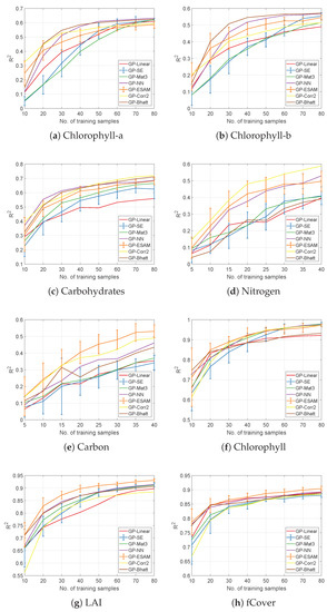 In the next experiment, we test how the performance of the models vary with training set size. The results are shown in Figure 3. Since, both and performance metrics showed congruent results in the first experiment, only metric is reported in the remainder of the paper. The performance curves were obtained by using a modified form of repeated 10 fold cross-validation. In each iteration of the cross-validation, the models were trained on only a random subset of the samples in the training fold. The size of the subset was set to the training set size for which performance is desired to be measured. By varying the size of the subset, the performance as function of training set size was obtained. This process guarantees that the size of the test set is same, even though the size of the training set is varying, so that the results obtained from models trained on training sets of different sizes can be compared. In this experiment, we did not exhaustively cover all of the covariance functions, but only chose a representative set. Only standard deviations of the squared exponential covariance function and the exponential spectral angle mapper are shown for comparison.