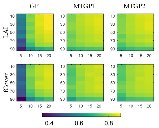 Comparison of GP and multitask GP for vegetation parameter estimation. Performance measured by .