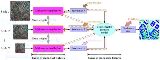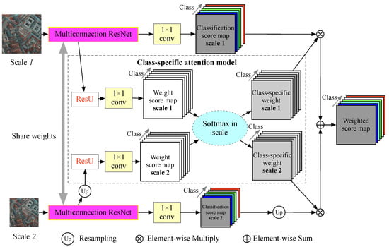 A class-specific attention model is proposed to fuse multiscale features to improve the multiconnection ResNet further, as shown in Figure 4. Different from direct fusion methods, e.g., averaging or concatenating, which ignore the importance of multiple features at different scales, this model aims to learn the different contributions of various features for each geo-object in each scale.
