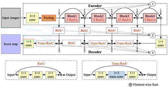 As shown in Figure 3, the detailed architecture of the proposed multiconnection ResNet is an encoder-decoder network. The encoder part is based on the residual network (ResNet), with 101 layers []. The ResNet is mainly constructed of four blocks, each of which contains several stacked residual units (ResUs). The fully connected layer and the average pooling layer at the end of the original ResNet are removed in order to get the dense feature map. The resolution of output feature maps is resampled to one-eighth of the original image in the encoder stage by using dilated convolution following a similar strategy as in []. During the decoder stage, the designed transposed residual units (Trans-ResUs) are applied to up-sample the low-resolution feature maps to higher-resolution classification maps. Different from ResU, the middle convolution in Trans-ResU is changed to the transposed convolution. ResU fuses the multiple features that are generated by previous layers in the encoder stage during the up-sampling process.