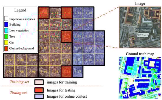(2) ISPRS Potsdam dataset. This dataset is provided in the framework of the ISPRS Potsdam 2D Semantic Labeling Contest, which includes 38 images with 6000 × 6000 pixels and about 0.05 m spatial resolution, as shown in Figure 6. There are four channels for each image: near infrared (NIR), R, G, and B; corresponding DSM and nDSM data are also available. Six land cover classes are distributed in the dataset: impervious surfaces, buildings, low vegetation, trees, cars, and clutter/background. The clutter/background class corresponds to a mixture of some geo-objects that are not of interest in our classification experiment. The ground truth maps of 24 images are offered and the organizers for the online contest keep the other 14 images. The organizers ended the online competition in the summer of 2018 and published all of the data. In the experiments, we split the 24 images with available ground truth maps into a training set of 20 images and a testing set of four images, which are shown in Figure 6. We extended the testing set with the other 14 images that are used for online contest to make the division more balanced. It should be noted that only three channels (NIR, R, G) were used for training and testing in the experiments.