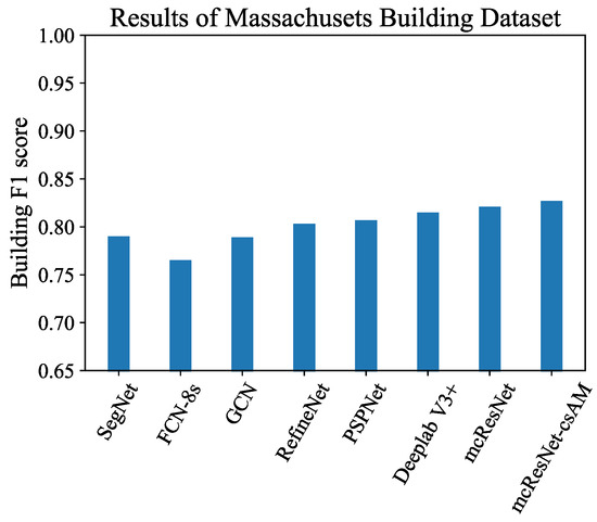Bar chart of F1 scores of various methods for Massachusetts building dataset.