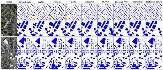 Four image patches containing buildings with different sizes and shapes were selected for visual comparison, as shown in Figure 8. It can be observed that FCN-8s performed the worst in identifying various sizes of buildings. To be specific, FCN-8s was not able to detect each single instance for small buildings, but could only identify building areas with blurred boundaries. The results of GCN, DeepLab V3+, RefineNet, PSPNet, and mcResNet are significantly better. However, they are still inadequate for preserving the shape details and fine edges. In addition, the classification results of large buildings by GCN are not homogeneous enough. SegNet can perform better in detecting small buildings, but it results in more false negatives, especially for large buildings. In contrast, mcResNet-csAM can achieve scale-adaptive classification results by taking the multiscale nature of various geo-objects into account, i.e., large buildings appear more homogeneous, and small buildings are detected with well-preserved structural details and boundaries. This confirms that our proposed end-to-end FCN is able to fuse the multilevel and multiscale deep features to enhance classification performance.