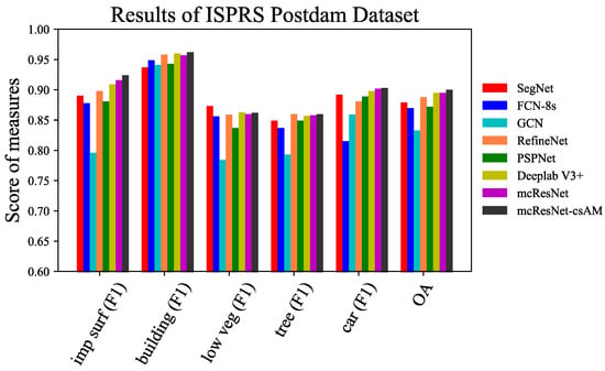 Table 2 and Figure 9 report the F1 scores and OA for different methods. It can be observed that (1) mcResNet-csAM outperforms other methods overall, although DeepLab V3+ can achieve optimal F1 scores for low vegetation with slight improvements and (2) mcResNet shows comparative performance with other methods, except mcResNet-csAM. This reveals the advantages of the proposed approach. Specifically, the proposed mcResNet-csAM and mcResNet exhibit obviously greater F1 values than other methods for classifying cars.