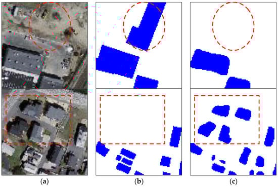 In our experiments, some inaccurate ground truth maps were noticed in the above two datasets, such as those that are shown in Figure 11 and Figure 12. For the Massachusetts building dataset, the associated ground truth building labels were retrieved from OpenStreetMap. Some buildings in the images of the dataset are not labeled in the corresponding ground truth maps, and vice versa, due to the time difference between image acquisition and building information collection by OpenStreetMap, as shown in Figure 11. Moreover, annotation errors are also unavoidable, especially for VHR images. For instance, obvious mislabeling also appeared in the ISPRS Potsdam dataset, as illustrated in Figure 12.