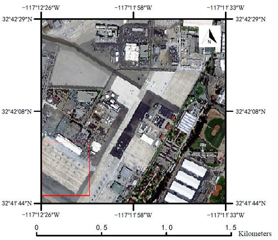 The second dataset was captured over the Sandiego airport in CA, USA. This dataset is with a spatial resolution of 3.5 m per pixel. The colour image of the dataset is shown in Figure 5. The red square with a size of in Figure 5 was selected as the under test image for the experiment. The color image of this test image is shown in Figure 6a. We deemed 38 planes (partly marked by arrows) as the anomalous objects for the HSI AD. The background objects included roof, ground, road, and Airpark. The ground truth which indicates the location of the anomalies is shown in Figure 6b.