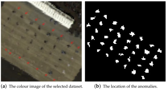 The first synthetic dataset was collected over San Jose in United States of America (USA) on 28 May 2014. The image size was pixels. A series of image blocks with a size of are used as anomalous targets and embedded in the background. Those anomalous pixels were mixed with of a ship pixel and of the background pixels which were replaced by anomalous targets. The colour image and the ground truth image are shown in Figure 2a,b respectively.