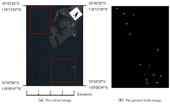 The first dataset was collected at Louisiana in USA on May 24, 2010. The island and the sea were deemed as the background of the dataset. The ships were deemed as the anomalies. The data set is downloaded from National Aeronautics and Space Administration (NASA), file f100524t01p00r09. The data set was with a spatial resolution of 12.2 m per pixel. The colour image and the ground truth image are shown in Figure 4a,b respectively. The locations of some anomalous targets were marked in red squares in Figure 4a.