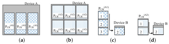 Assume , the of Algorithm A1 and A2 can be expressed as from Figure 11b–e. In Figure 11, there are two relationships between the PCR of Algorithm A1 and A2. In general, where and mean of A1and A2 respectively. However, in some situation, the relationship may be (when , in Figure 11c,d).