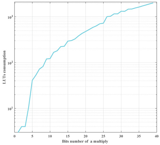 In Figure 11, the product of the arithmetic operations amount C and the resources for basic operator R is defined as algorithm–hardware–cost–factor (AHCF) and marked as . The means the resource requirement in theory for the algorithm to detect one PUT with a certain time. This “certain time” is equal to the processing time of one arithmetic operation. In this paper, to simplify the expression, it is defined as the operation cycle.