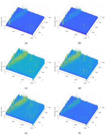 With the results from the Figure 17, it can be found that the background of the sea is greatly suppressed by the CRD detector. However, some pixels in the island produce great anomaly score by the CRD detector. From the anomaly score by Figure 17c–f, the anomaly score is similar to the anomaly score image from LRXD and CRD. Especially, from the results in Figure 17c,d, after structure pruning, the detector can give almost the same results as the original SAE based detector. Those results prove that the pruning operation can keep the detection accuracy while removing the redundant neurons.