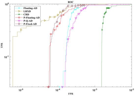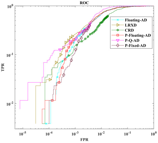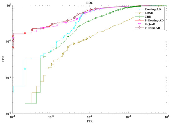 To illustrate the sensitive character in terms of the detection accuracy by the proposed approach, the ROC curves on Sandiego data set by the LRXD, CRD, Floating-AD, P-Floating-AD, P-Fixed-AD and the proposed P-Q-AD are shown in Figure 20.