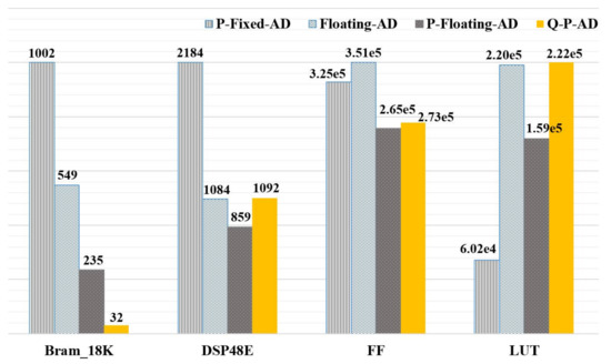 From the resources consumption in Figure 23, due to high data precision with more bits for each data, Floating-AD, and the P-Fixed-AD consumes more BRAM_18Ks than P-Q-AD and the P-Floating-AD. With a smaller network structure and lower precision operation, P-Fixed-AD can implement higher parallel design than Floating-AD. However, more weights need to be stored. Thus, it consumes maximum BRAM_18Ks and DSP48E.