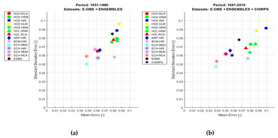 Adimensional error of mean (x-axis) and standard deviation (y-axis) of datasets versus validation data: (a) for the 1951–1980 time period, in which 73 stations out of 79 were available; (b) for the 1981–2010 time period, during which all 79 stations were used.