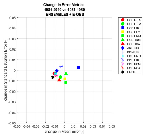 Change in dataset performance for mean error (x-axis) and standard deviation error (y-axis) from the 1951–1980 to the 1981–2010 time period for the 13 ENSEMBLES models and the E-OBS dataset.