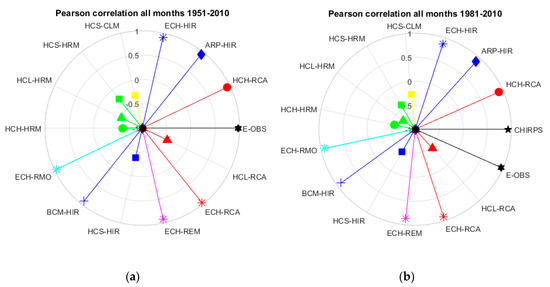 Figure 4 shows the Pearson correlation coefficient, evaluated between monthly rain gauge precipitation and gridded dataset precipitation, for the whole observation period (1951–2010) and for the 1981–2010 time period only. The correlation shows that the same models that had good relative error metrics are the best-performing ones (ECH-driven models, HCH-RCA and ARP-HIR), with the addition of BCM-HIR. However, the most correlated dataset of all (r = 0.97) is E-OBS, which was only an average performer with regard to relative metrics. CHIRPS is once again an excellent performer, with a correlation value of r = 0.94.