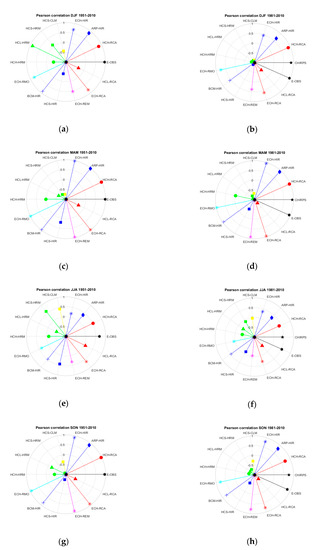 The six anticorrelating models show a wildly inconsistent behavior from season to season and from 1951–1980 to 1981–2010. For example, HCL-HRM (r = −0.52 for all months in the 1951–2010 time period) has a correlation value r = +0.92 in the winter months for the 1951–1980 time period (not shown in figures), and r = −0.87 if we consider the 1981–2010 time period, with seasonal values for the 1951–2010 period varying from r = +0.87 in winter to r = −0.59 for spring.