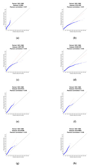 QQ-plots for gridded data with Pearson correlation values with rain gauge above 0.9. Monthly precipitation versus rain gauge data at all stations, from 1951 to 2010: (a) for E-OBS reanalysis; (b) for ECH-HIR model data; (c) for ARP-HIR model data; (d) for BCM-HIR model data; (e) for ECH-RCA model data; (f) for HCH-RCA model data; (g) for ECH-REM model data; (h) for ECH-RMO model data.