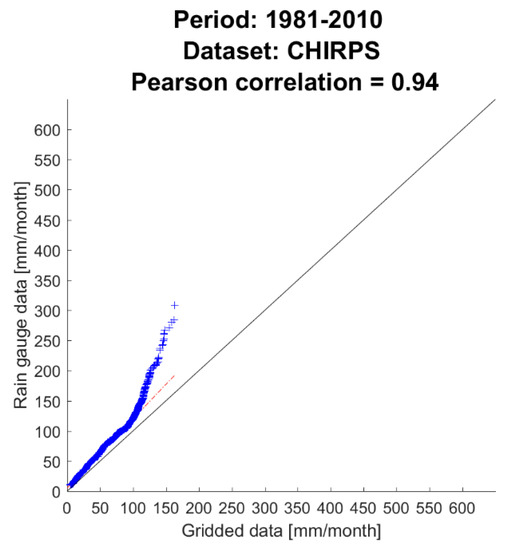 The validation has been conducted for monthly precipitation, because of its importance and relevance for research and for applications. First of all, it is used to build monthly normal climatology, which is a fundamental climatological parameter. It is also used: in calculating drought indices like Standard Precipitation Index (SPI; [49]); in evaluating rainfall seasonality, with, e.g., the Precipitation Concentration Index (PCI; [50]); in trying to understand the seasonal correlation between precipitation and teleconnections (e.g., El Nino Southern Oscillation, North Atlantic Oscillation); and runoff of monthly precipitation is also used as a driver of hydrological modeling (e.g., [51]). Finally, it must also be taken into account that many available datasets are only produced with monthly values, or restricted to monthly sampling (e.g., gauge-based precipitation products; see for instance [52]).