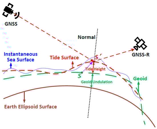 The principle of GNSS-R altimetry is to use the distance difference between the GNSS reflection signal on sea surface and the direct signal to the receiver to achieve the sea surface altimetry. In the last few years, several GNSS-R satellite missions including the TechDemoSat-1 (TDS-1) satellite [], the Cyclone Global Navigation Satellite System (CyGNSS) mission [,] and the Bufeng 1A and 1B satellites have been put into operation []. In recent years, the GNSS-R altimetry has achieved advances in specular reflection point positioning, phase altimetry at grazing angles, sea surface height (SSH) retrieval and retracking techniques, etc. [,,,,,,,,]. Compared with the traditional satellite altimeter, GNSS-R altimetry has the advantages of a rich signal source, low payload cost, all-weather, all-day time, low power consumption, and so forth. GNSS-R can acquire multiple sea surface reflection signals at the same time based on multi-channel receiver. Combined with multiple satellites network, GNSS-R can achieve high-spatial-resolution global sea surface altimetry. To take advantage of the high resolution and realize the application, the accuracy of GNSS-R satellite sea surface altimetry needs to reach cm level, which is comparable to SSH obtained by satellite radar altimeter. As one of the main error sources in GNSS-R altimetry, the positioning error of the specular reflection point restricts the improvement of the altimetry accuracy [,]. The specular reflection point is the point which minimizes the distance across which the GNSS satellite signal reaches the receiver through reflection on the reflection surface []. It is the datum point and reference center of the GNSS-R signal reflection geometry and relevant parameters. The positioning error of the specular reflection point affects the sea surface altimetry accuracy, which is directly related to the path error, on the reference datum [,,,,]. In 1997, Wu proposed a two-step method to search the position of the specular reflection point on the reference ellipsoid []. In 2009, Gleason proposed the minimum path length (MPL) method which determined the specular reflection point on the WGS84 ellipsoid as an optimization problem []. In 2012, Semmling proposed the osculating sphere method which provided a simpler way to search the specular reflection point on the ellipsoid [,]. In 2018, Southwell proposed a latitude dependent unit difference positioning method that satisfied Snell’s Law on the WGS84 ellipsoid, this method is more accurate and more computationally efficient than MPL method []. The signal reflection surface of the GNSS-R altimetry is the instantaneous sea surface. However, among the reflection reference surfaces selected by the current specular reflection point geometric positioning methods, the one which is the closest to the instantaneous sea surface is the earth ellipsoid surface. The elevation difference between the ellipsoid surface and the instantaneous sea surface, sea level height (SSH), is not considered in the positioning, resulting in non-ignorable positioning error of specular reflection points [,,] (see Figure 1). SSH can be decomposed into static-state elevation and time-varying elevation: 1) The former is the elevation difference between geoid and the reference ellipsoid surface—the geoid undulation. It is determined by the earth’s own gravity, with low time variation. 2) The latter is the real-time change of SSH from geoid to the instantaneous sea surface caused by tides, winds, ground rotations, mesoscale eddies, currents, tsunami and other external dynamics, ie, dynamic topography, which varies with time.