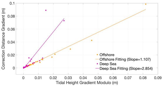 The average value and standard deviation of the tidal height gradient modulo and tidal correction gradient modulo of the offshore and deep sea segments are shown in Table 2, and those of each segment are shown in Figure 6, Figure 7 and Figure 8. The tidal height gradient modulo and its standard deviation in the offshore segments are significantly higher than those in the deep sea, with the gradient of about 2.5 times and the standard deviation of about 3.5 times. The tidal height change in the offshore is more dramatic than that in the deep sea, and the difference between segments (with different tidal amplitudes and phases) is greater. Compared with the large difference of the tidal height gradient modulo in the offshore and deep sea segments, the changes of the positioning correction gradient modulo in the two sea areas are closer. The correction gradient modulo in the offshore and its standard deviation are respectively 1.2 and 2 times those in the deep sea. The tidal height gradients modulo in the offshore segments have a positive correlation with the positioning correction gradient modulo. They are very close for all the segments, and the difference between them does not increase significantly with the increase of the gradient (see Figure 6 and Figure 8). This indicates that the variation of the tidal height in the offshore increases, and the change of the tidal correction is increased, the tidal positioning correction gradient modulo has a good response to the tidal height gradient modulo in the offshore. However, the difference between the two in the deep sea is larger, and the difference increases significantly with the increase of the gradient. The direct cause is that the gradient of the tidal positioning correction in the deep sea is higher than the tidal height gradient modulo; it does not decrease correspondingly as the tidal height gradient modulo decreases (see Figure 7 and Figure 8). It can be considered that the variation of the tidal positioning correction is more consistent with the tidal height gradient modulo in the offshore where the tidal height changes greatly. While the tidal height change tends to be gentle in the deep sea, the change of the tidal positioning correction does not greatly decrease with it. The sensitivity of the response of tidal positioning correction to the change of the tidal height is reduced in the deep sea compared to offshore. It is speculated that the change in terrain and gravity anomaly in the deep sea is more dramatic than in the offshore with the relatively flat continental shelf underwater, which makes the geoid undulation and the total elevation positioning correction change more in the deep sea []. This may contribute to the decreasing of the response sensitivity and the maintenance of high tidal correction gradient in the deep sea, which is consistent with the expression that the elevation positioning correction is affected by both gravity anomaly and tidal height in Section 2.2.