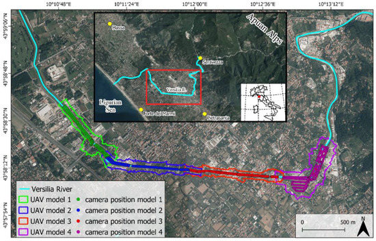 From the Apuan Alps, many steep streams characterized by a typical torrential regime (namely general low flow rate and high flow rate following heavy rainfall) flow down towards the Ligurian Sea, crossing the Versilia plain. The Versilia River (22 km long) is one of the most important of the area, with a basin extension of 160 km2. Although this area has always experienced floods and disasters sometimes associated with life losses, human activities have extensively increased. Over the centuries, these phenomena have induced many hydraulic works aimed at contrasting the risks of flooding in the area, but the interventions have sometimes been ineffective [21,22]. After the 19 June, 1996, hydrogeological disaster, which resulted in 13 deaths and in the damage worth hundreds of millions of euros [23], a deep hydraulic re-arrangement of the Versilia River was made to defend the area from flood risk. The important 1996 event was the last one to hit the study area [21], and for this reason, it is difficult to judge whether the hydraulic works actually managed to protect the area.