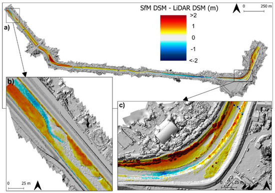 Difference between SfM DSM and LiDAR DSM inside the channel. a) Studied area; b and c) magnified areas corresponding to the black boxes in frame a.