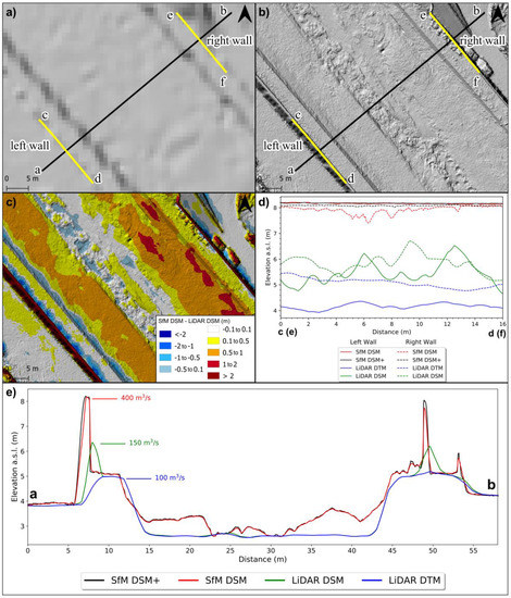 Hydraulic simulations heavily depend on the relevant features (e.g., channel bottom shape and depth, bank shape and height), which are well-solved in the DEMs available. Figure 6e shows a typical section of this river, where thin high walls are superimposed to the river banks. In the LiDAR DTM profile (blue line in Figure 6d,e), the river embankment walls were absent; the filtering processing used for DTM realization was calibrated to remove anthropic features such as buildings and walls. In the LiDAR DSM profile (green line in Figure 6d,e), the walls were only partially represented because of the low resolution. Indeed, a 1-m cell size DEM was unable to resolve a 40 cm thick wall, as in this case (Figure 6a). The SfM DSM (originally a cell size around 5 cm and resampled to 10 cm, red line in Figure 6d,e) reproduced the two embankment walls, but the right wall was up to 70 cm lower than the left one. The SfM DSM+ (originally a 2.8 cm cell size DEM resampled to 10 cm, black line in Figure 6d,e) reproduced the two embankment walls better than the other DEMs.