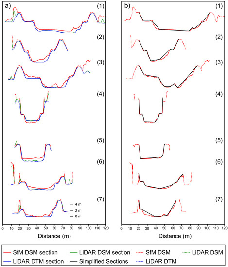 Comparison of the cross-section profiles derived from different topographic data. See Figure 2 for the locations of the cross-sections along the channel. (a) Profiles derived from SfM DSM, LiDAR DSM and DTM. (b) Profiles derived from SfM DSM and Simplified Sections.