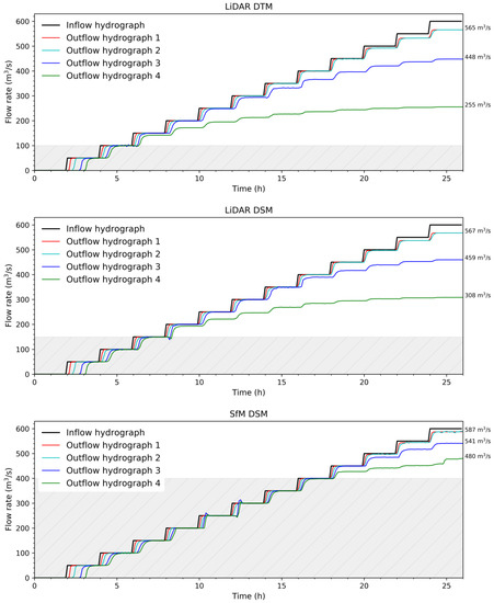 The maximum flow rate using the SfM DSMs as a topographic base was around 400 m3/s (Figure 8), in agreement with the estimated maximum flow rate of the river [33,34]. This flow rate was 2–3 times the one estimated using LiDAR data. In terms of surface detail, this result is well explained, for example, in the profile comparison of Figure 6e. The profile of LiDAR DTM was able to capture only the larger earth embankments, but it completely missed the walls; consequently, the maximum flow depth was around 2.5 m, and the maximum flow rate was only 100 m3/s. The LiDAR DSM captured a portion of the embankment walls, allowing a maximum flow depth of 4 m and reaching a maximum flow rate of 150 m3/s. The much higher maximum flow rate of the simulations based on the SfM DSMs was due to their good capability of reconstructing even the thinner embankment walls with a maximum flow depth of 5.5 m.