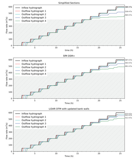 The plot of the flow rate of the simulation based on the simplified sections in Figure 9 gave results similar to the simulations based on the SfM DSMs. This means that the overall profile could be greatly simplified, as long as the main break-in slope points and the correct height information of the walls were present (Figure 7). This suggests that a speedy DGPS survey acquiring only the main break-in slope points could be sufficient for fluvial hydraulic modeling. The greatest limit of this approach is that, once acquired, the sections were fixed and could not be moved to solve any problems arising during the modeling phase. In the case of LIDAR DTM with updated bank walls (the best representation of the channel geometry of 8–10 years ago), the maximum flow rate was again around 400 m3/s (Figure 9).