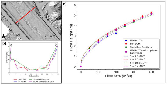 Overall, there was a good fit between the flow rates derived from the Manning formula and the ones computed using FLO-2D, although the flow rates derived from the Manning formula depend only on the shape of the considered section; instead, the flow rates calculated using FLO-2D at any section also depend on the shapes of the nearby sections. In the flow height versus flow rate plot (Figure 10c), the rating curves SfM DSM and LiDAR DTM with updated bank walls were very similar in terms of shape and fitting slope values (0.00078 vs. 0.00075). They differ for an offset in the flow height up to 40 cm. SfM DSM had an irregular bottom profile compared to LiDAR DTM, which had a much more regular flat channel bottom. The flow height was calculated from the minimum elevation, which introduced the height gap in the plot.