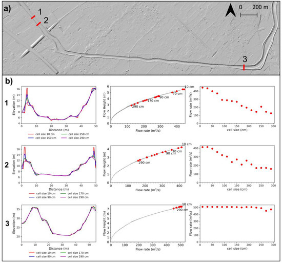 Effect of topography resolution on the maximum flow rate for three selected sections. (a) Hill-shaded map of a reach of the Versilia River with the location of the sections. (b) Plots of topographic profiles, maximum flow rate vs. maximum flow height, as function of the topography resolution and maximum flow rate vs. cell size.