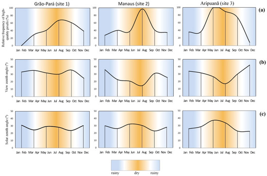 Seasonal variations in the (a) relative frequency of high–quality pixel retrievals, (b) view zenith angle (VZA), and (c) solar zenith angle (SZA) for the three sites selected from north to south of the Amazon. The location of the sites is indicated in Figure 1. Results refer to 2008, a non–drought year.